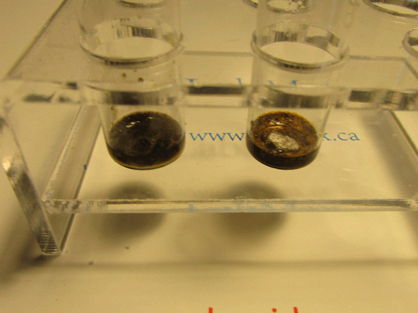 We use 2 special test vials. We add only a little of grinded pill less that the amount of test reagent. There is only 0.1 ml of test reagent in each vial. The initial color change in test vial A is green getting darker green. The initial color in vial test 2 is red getting darker red.