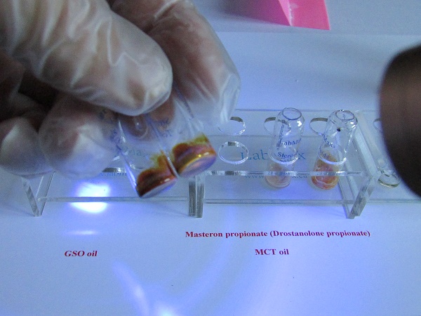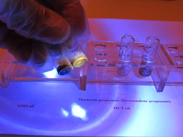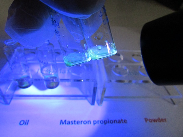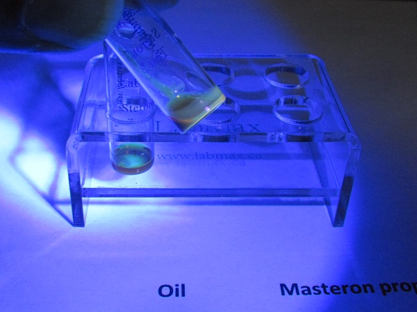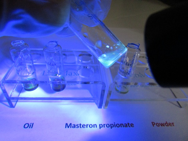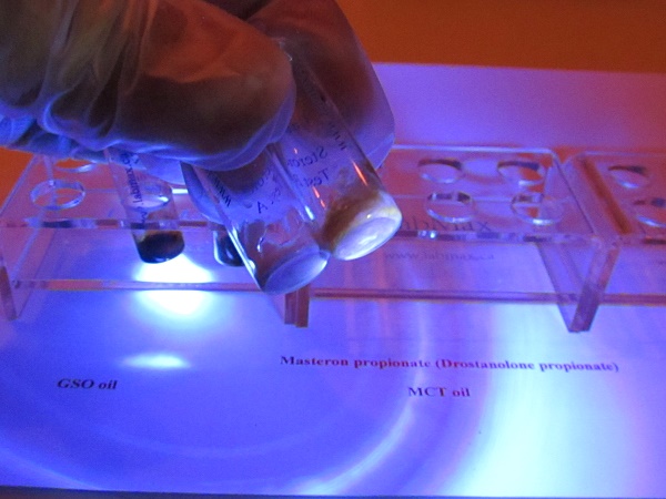 You drop a little bit, notice there is only a little of test reagent so you drop usually less than the volume of test reagent it can be anything from one to a few drop of oil from syringe. There is a little initial color change for oil, getting darker red later while there is no change for a longer time when you drop raw powder. For oil it takes a few minutes to see better the fluorescence in vial B under 365 nm UV light; it will be like yellow – dark yellow, while sample in vial A looks like light brown - violet. Sample with raw powder gives blue fluorescence in vial B and brighter blue in vial A. If you get no fluorescence it means there is no hormone. If you get different colors it means that there is something else or your sample is contaminated with other steroids.