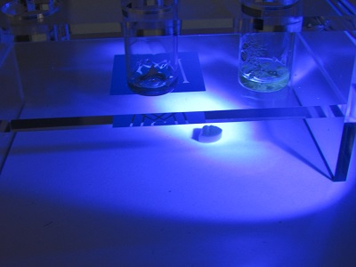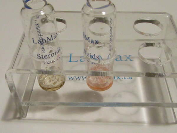 It is very easy to test proviron, you test it like anything else using vials A and B. You take a little bit of the pill; you never drop the whole pill and grind your sample into powder. You use razor blade just to get tiny bit and this is all what you need. There is no initial color change but you will see blue fluorescence in vial B developing right away. In a few minutes you will see the color changing in B from faint yellow to red / pink. This is how proviron is reacting with test reagent. There no initial color change in vial A but it will change slowly from light brown -green to red - green and to red. If you get for example dianabol pill the initial color would be right away red, see instruction about testing dianabol. If your pill does contain fillers like proteins, vitamins you will have right away initial color change into red but you will still have the blue fluorescence. So before testing it is good idea to find out if only neutral filler was used or there is something else. Please note that pharmaceutical companies would never add vitamins, proteins etc to the medicine because it will interfere how the medicine works. This is why things like corn starch is used as filler. There is no intial color change after adding the tiny part of the pill but you can see that the color is slowing getting pink and later red in vial B and also in A later. It is simple UV test; no fluorescence means no hormone inside.