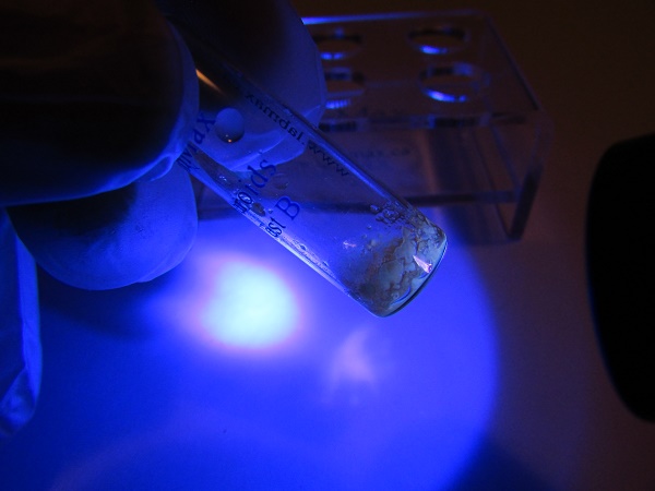 blue - greenish fluorescence in vial B.