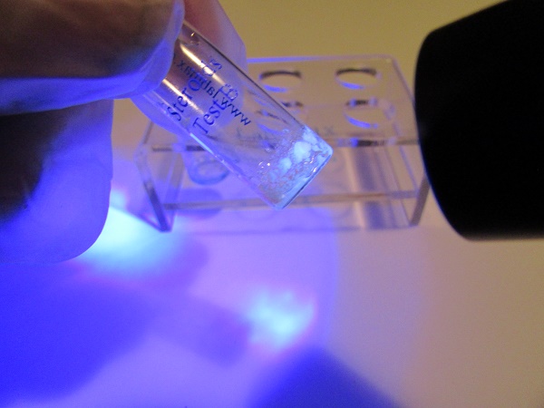 blue - greenish fluorescence in vial B right away.