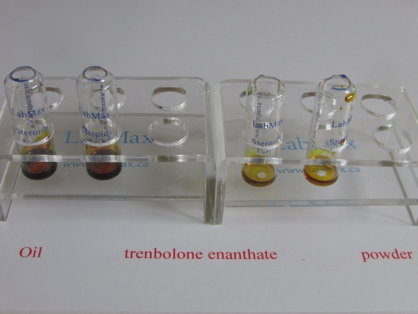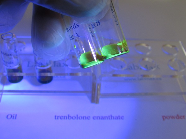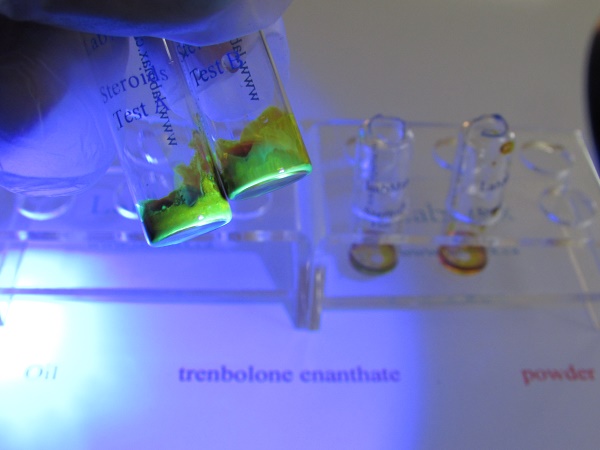 The initial color will be yellow changing to orange in both test vials. Later it will become dark brown. For positive identification you need to watch test vial B under UV light (365 nm) only then you will have positive identification. When you see the nice green color under UV light (fluorescence) then you will know that you have positively identified trenbolone enanthate. You might want to watch the fluorescence in dark room. Take a note that both vials A and B develop green fluorescence, for example nandrolone decanoate (deca) is also green in vial B under UV. Although deca is not so bright green, it is more mat green. The bright green fluorescence in both vials A and B is very characteristic for tren; you cannot miss it when testing.
